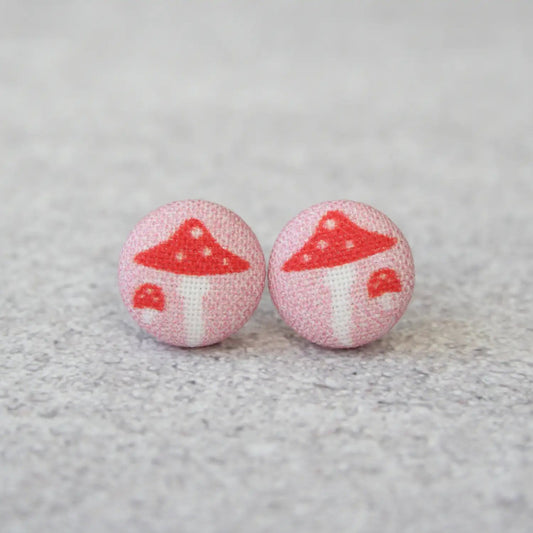 Pink Mushroom Fabric Button Earrings | Handmade in the US