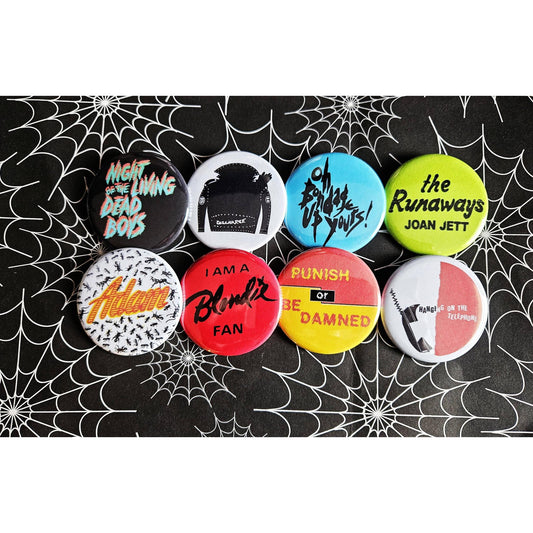 Pop culture items in this collection feature celebrities like George Michael, Cyndi Lauper, Kurt Cobain, and Dolly Parton, as well as motifs like smileys and mixtapes, to name a few.