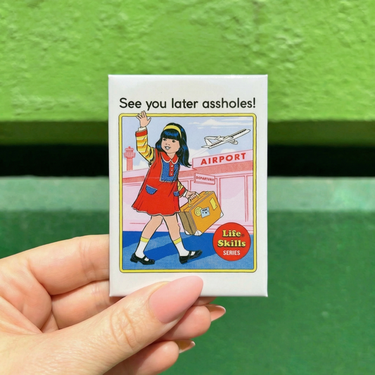 See You Later Assholes Fridge Magnet | '80s Children's Book Style Satirical Art by Steven Rhodes