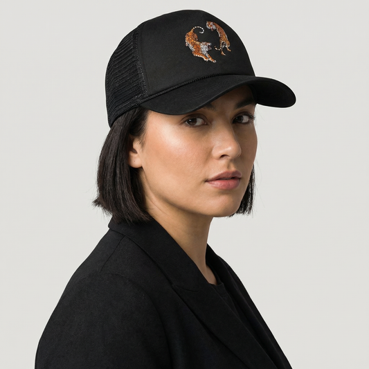 Tiger Mirror Trucker Hat | Black Adjustable Mesh Snapback Cap with Embroidered Tiger Design