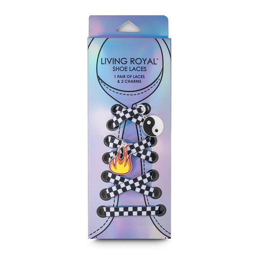 Black & White Checkered Shoelaces with Yin Yang & Fire Charms | Shoestrings with Charm Set