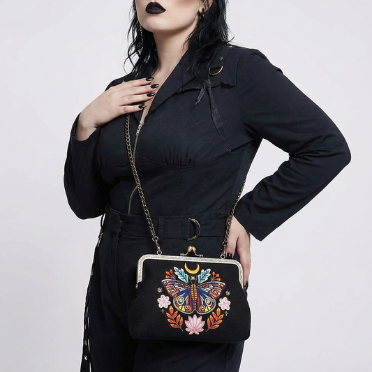 Moon Moth Vintage Kisslock Bag in Black | Embroidered Mystic Handbag with Detachable Straps