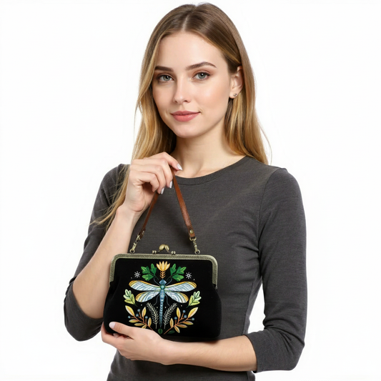 Dragonfly Vintage Kisslock Bag in Black | Embroidered Nature-Inspired Handbag with Straps