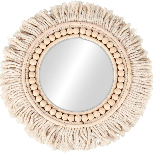 Boho Beaded Fringe Round Wall Mirror | Cotton Fringe & Wooden Bead Decorative Mirror