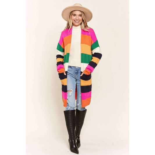 Multi Color Stripe Cardigan with Pockets | Open Front Long Knit Sweater [Sizes SM-L]
