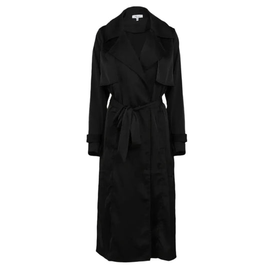 Satin Trench Coat Open Front And Detachable Waist Tie in Black [Available in SM-L]