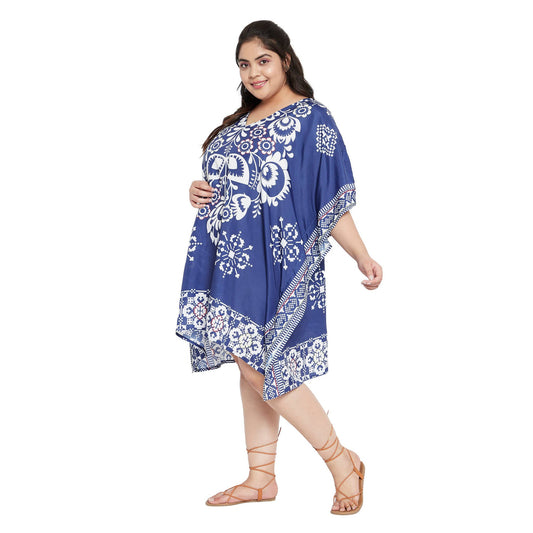 Plus Size 1X-3X Floral and Leaf Printed Tunic Short Kaftan in Blue