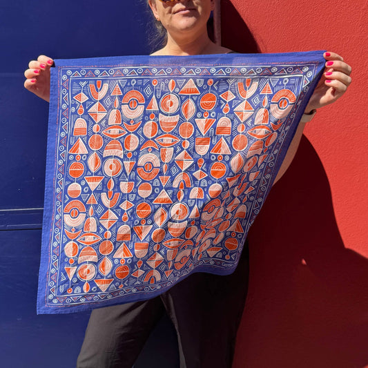 Gertie Bandana in Blue with Orange and Peach in Multi Shapes Designs | 22" x 22" Premium Cotton
