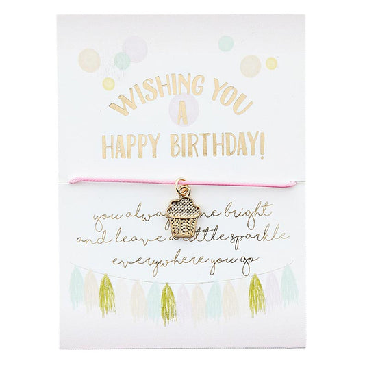 Wishing You a Happy Birthday Cupcake Charm Cord Bracelet on a Gift Card