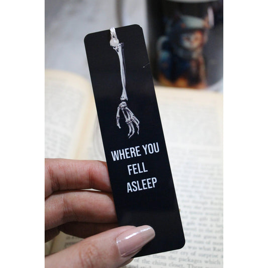 Where You Fell Asleep Metal Bookmark with White Tassle | Skeleton Hand Illustration