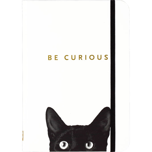 Curious Black Cat Journal in Matte White Cover | Hard Cover Binding Feline Notebook | 5'' x 7''