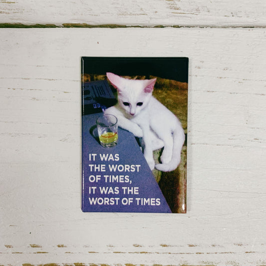 It Was The Worst Of Times, It Was Funny White Cat Magnet | Rectangular Magnetic Surface Fridge Decor | 3" x 2"
