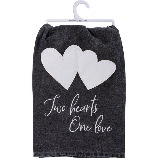 Two Hearts One Love Kitchen Towel | Black and White Stonewashed Tea Dish Cloth | 28" x 28"