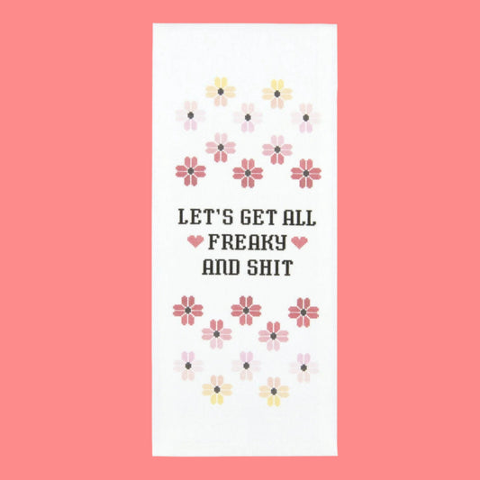 Let's Get All Freaky and Shit Cross-Stitch Print Dishtowel | Hangable Rude Funny Saying Cotton Towel