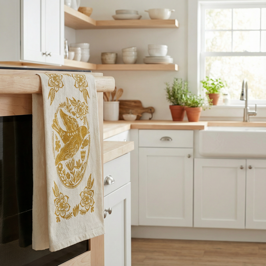 Scandi Style Folk Art "Peace Dove" Hand Illustrated Kitchen Towel | Hangable, Absorbent 100% Cotton Tea Towel or Dish Cloth