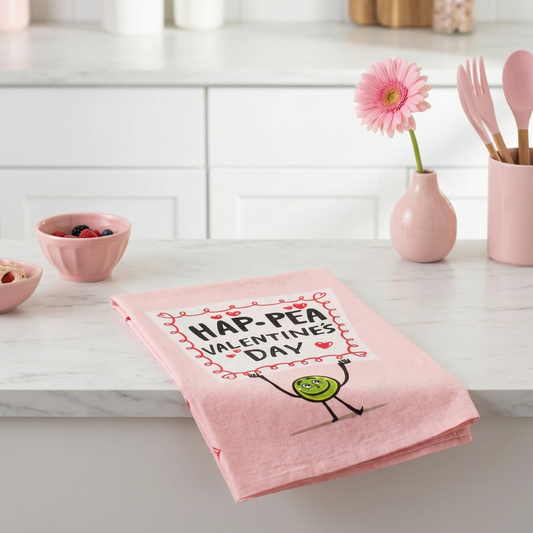 Hap-pea Valentine’s Day Kitchen Towel | Funny Valentine Pea Dish Towel | Pink Cotton Holiday Kitchen Decor