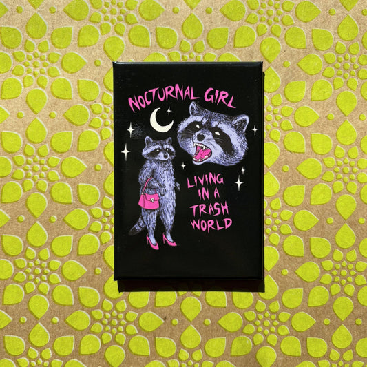 Nocturnal Girl Living in A Trash World Raccoon Rectangular Magnet | Refrigerator Magnetic Surface Decor