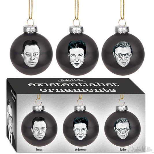 Existentialist Holiday Glass Mini Ornaments Set in Black | Featuring Camus, Sartre, and de Beauvoir