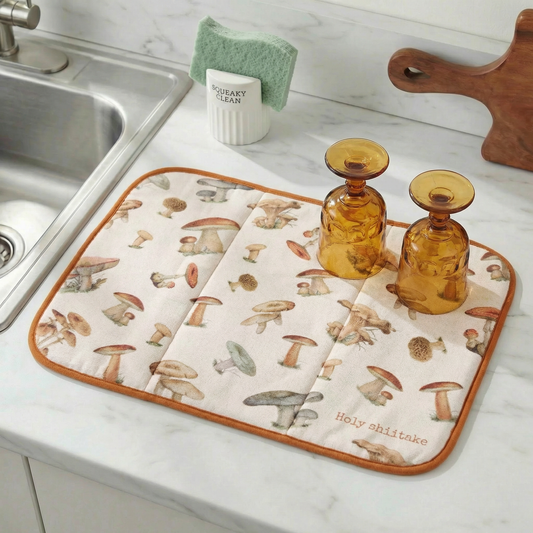 Holy Shiitake Ultra-Absorbent Drying Mat | Vintage Art of Wild Mushrooms Dish Drainer Pad | 21" x 14"