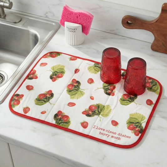 I Love Clean Dishes Berry Much Ultra-absorbent Drying Mat | Vintage Art of Wild Strawberries Dish Drainer Pad | 21" x 14"