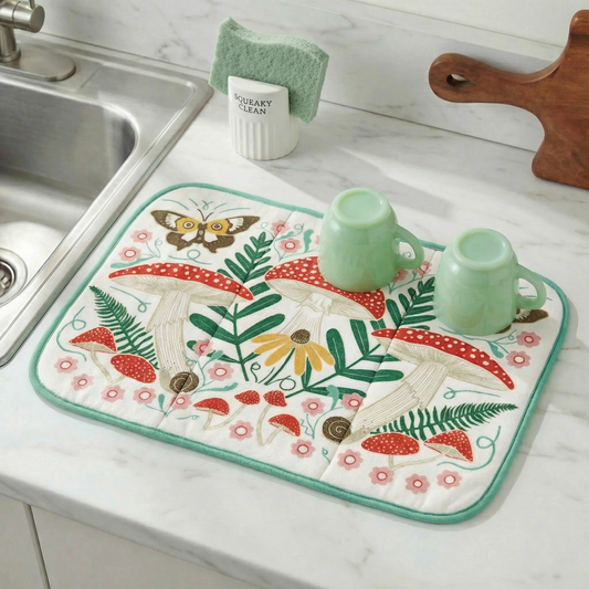Mushroom Art Ultra-Absorbent Drying Mat | Rustic Nature-themed Dish Drainer Pad | 21" x 14"