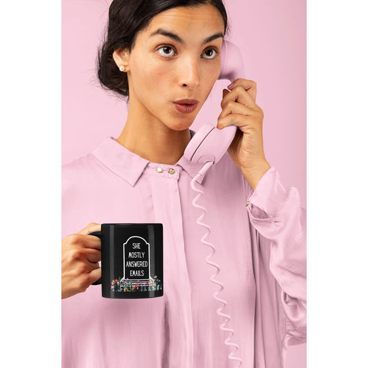 She Mostly Answered Emails in Grave Design 11oz Black Mug