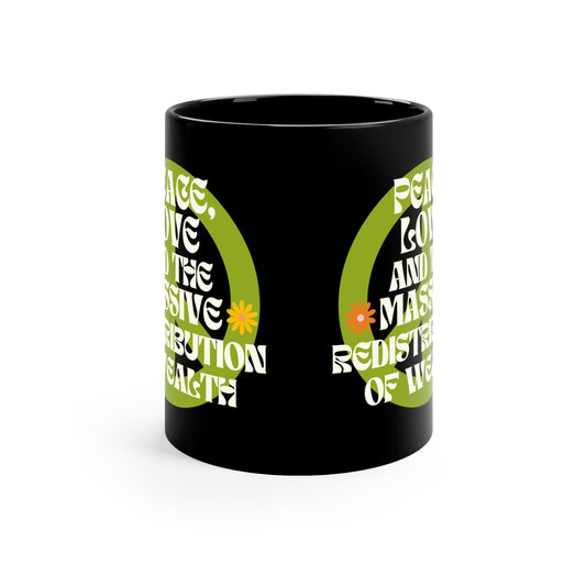 Peace, Love, and the Massive Redistribution of Wealth Mug in Black