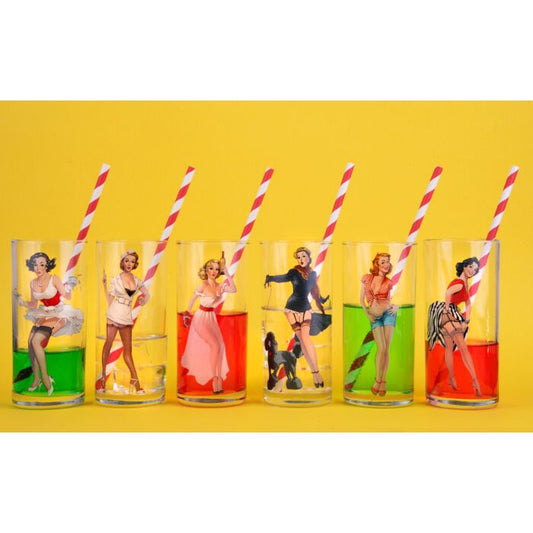 Kischy Pin-up Girls Cocktail Glasses Set of 6 | Retro Ladies Glass Drinkware | 9.5 oz