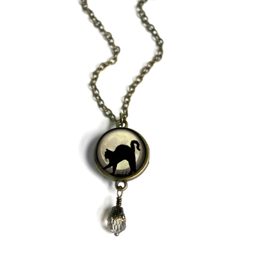 Goth Black Cat on Full Moon Pendant with Bead | Handmade in the US