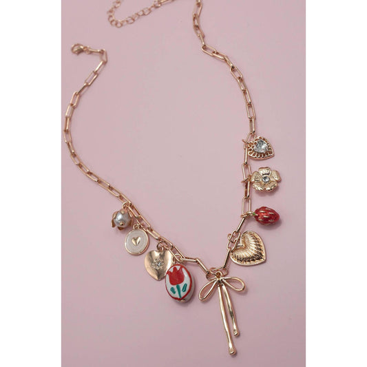 Coquettecore Bow Tulip Strawberry Toile Charm Necklace in Gold Plating with Red Accents | 16" Long | Paper Clip Style Chain