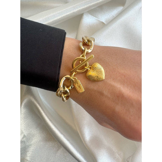 Etched Fingerprint Gold Chunky Chain Bracelet with Heart Charm | Handmade in Athens, Greece