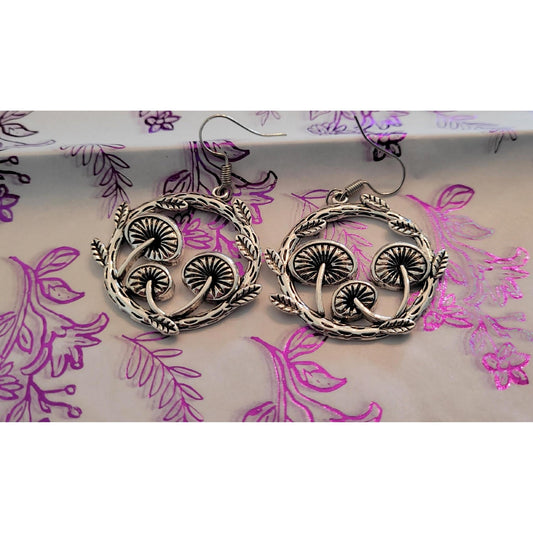 Mushroom Wreath Earrings | Toadstool Dangle Earrings in Antiqued Silver