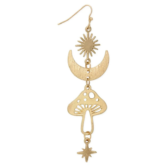 Celestial Magical Mushroom Gold Hook Earrings | 3" x 1" Gold Earrings