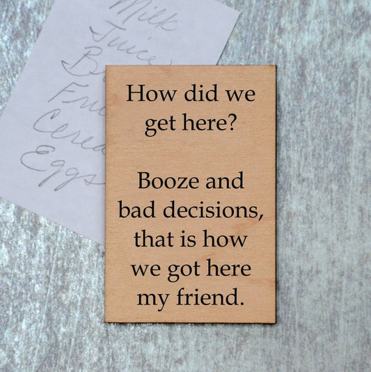How Did We Get Here? Booze And Bad Decisions Funny Wood Refrigerator Magnet | 2" x 3"