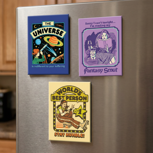 The collection is packed with sayings about aging disgracefully, eating too much cheese, correcting people’s grammar, and surviving the chaos of politics — basically the entire human experience in magnet form. You’ll spot work from Ephemera, Magik Missile, A Shop of Things, Heartfelt, The Found, Primitives by Kathy, Driftless Studios, GetBullish, and a rotating crew of small designers who excel at snarky one-liners. It’s like curating your own magnetic mood board, but with more profanity and cats.