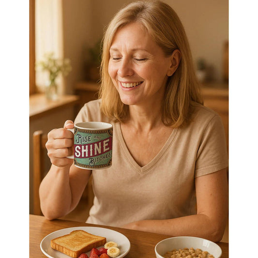 Rise & Shine Porcelain Mug Vintage Style | Wrap-around Design Ceramic Coffee Tea Cup | 12oz