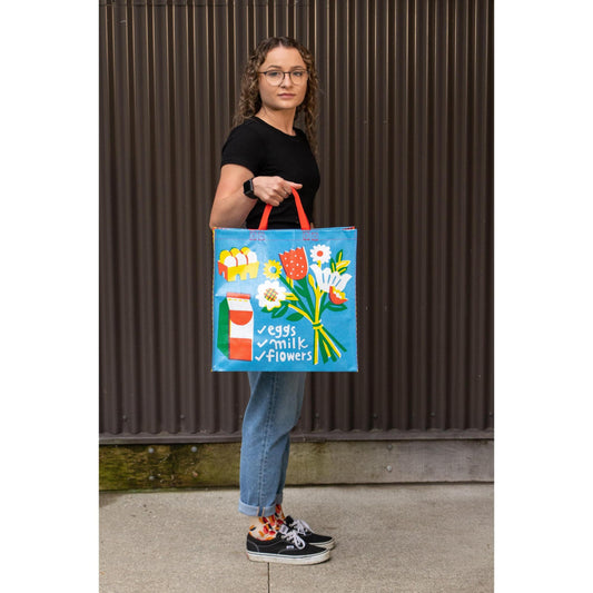 Eggs Milk Flowers Shopper Tote Bag | Post Consumer Material Shopping Bag | 16" x 15" | BlueQ at GetBullish
