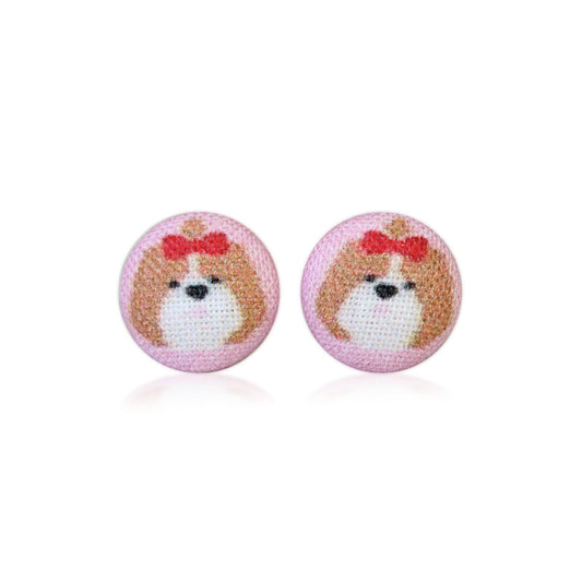 Fluffy Dog with Bow Fabric Button Earrings | Handmade in the US