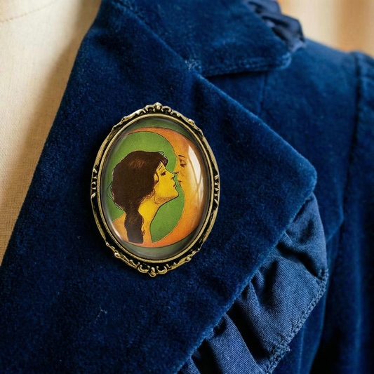 Moon Kiss Brooch Vintage Art Nouveau Crescent Moon | Celestial Victorian Style Glass Cabochon Pin