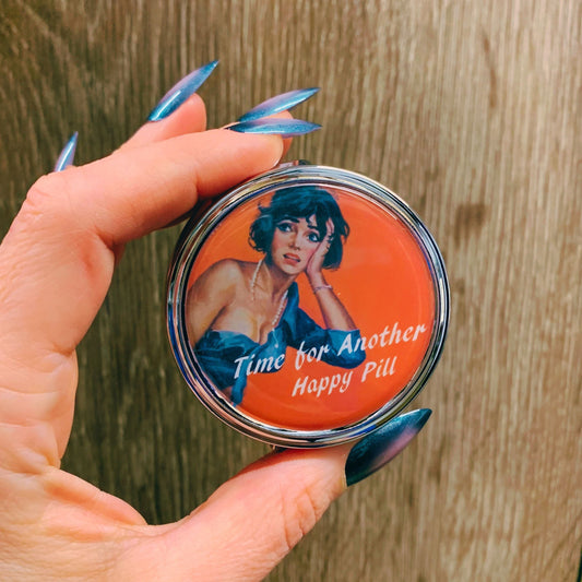 Time for Another Happy Pill Pill Box | Handmade 2.25" Round Pill Case | Retro Pinup Art