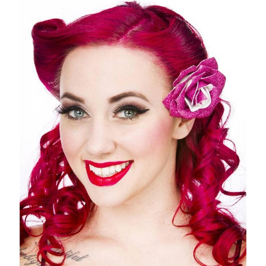 Sourpuss Pink Glittery Rose Hair Clip | Retro Rockabilly Pin-Up Sparkly Hair Accessory