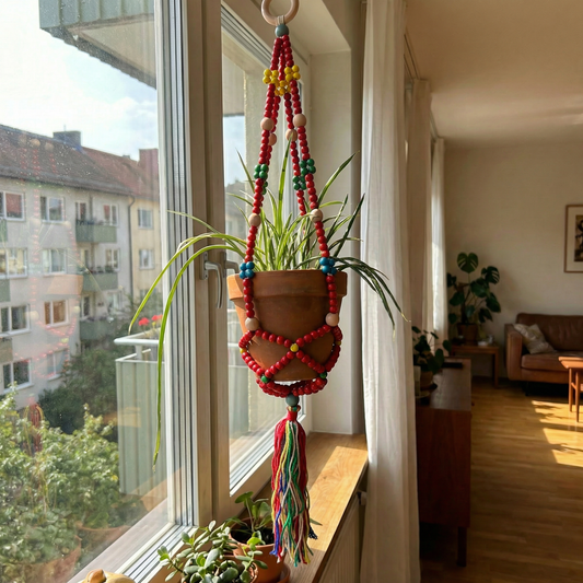 Red Macrame Plant Holder | Boho Hanging Decor Flowerpot Holder