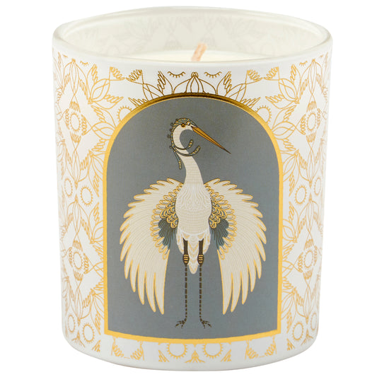 Nouveau Crane Sage Scent Jar Candle | Bird Pattern Metallic Gold Accent Frosted Glass | 35hrs Burn Time