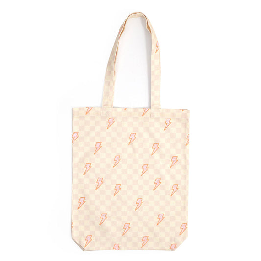 Checkerboard Lightning Bolt Tote Bag | Canvas Grocery Shopping Carryall Bag | 14" x 17"