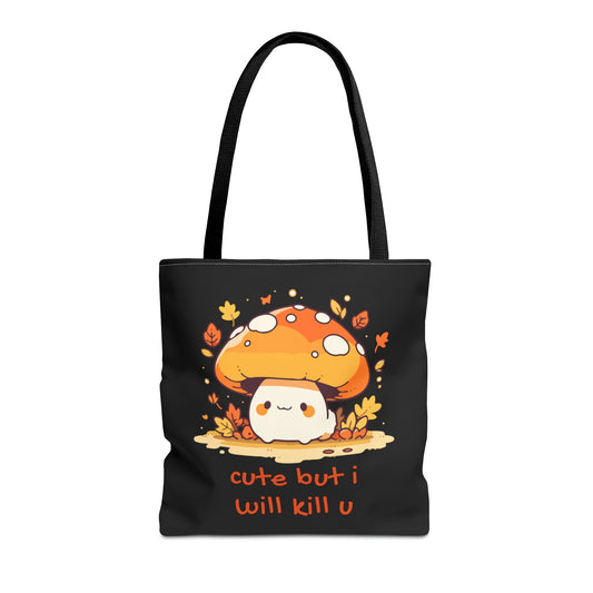 Cute But I Will Kill U Mushroom Tote Bag in Black | 16" x 16"