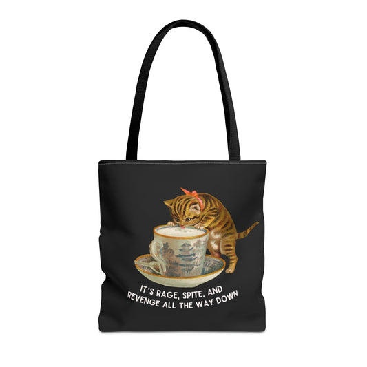 It's Rage, Spite, and Revenge All the Way Down Cat Tote Bag in Black | 16" x 16"