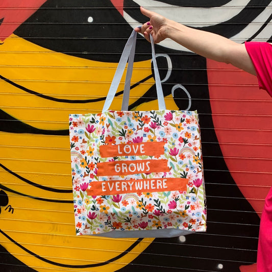 Love Grows Everywhere Shopping Tote Bag | Extra Large Market Eco Bag | 19.50" x 17.50" x 7"