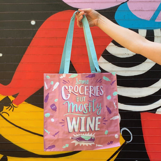 Some Groceries But Mostly Wine Large Market Tote Bag in Pink and Blue | 15.50" x 15.25" x 6"