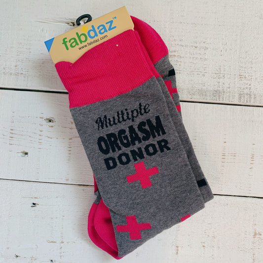 Multiple Orgasm Donor Men's Novelty Crew Socks | Grey and Pink Funny Cotton Socks | Last Call!