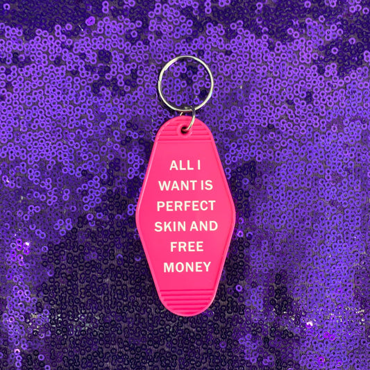 All I Want is Perfect Skin and Free Money Motel Style Keychain in Fuchsia Pink